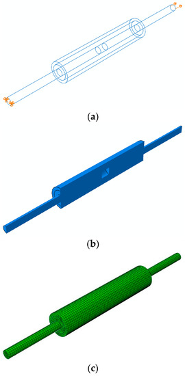 Generally, the experiments are time-consuming and involve high cost. As an alternative, the numerical method, i.e., finite element method used in the study, provides a more flexible and cheaper way to solve the practical problems [15]. Here, the nonlinear finite element model is developed for the mechanical analysis of a series of GSS connectors by introducing nonlinear material constitutive models [30]. For the sake of simplification, the ribs of the reinforcement bars and the sleeve, the grout and vent holes, the end sealing rubber and the wall thickness change of the sleeve displayed in Figure 1 are neglected in the present computational model, as depicted in Figure 3, so that the computational model of the GSS connector system only consists of the sleeve, the reinforcement bars and the grout. In addition, to simplify the computational analysis, the perfect bonding connection is assumed between adjacent structural components, which is also assumed for the analytical model developed in [2,8], due to the so insignificant slip and the good confinement in the sleeve. Certainly, one can introduce more complex bond-slip interfacial models for engineering analysis, according to one’s need [31,32,33].
