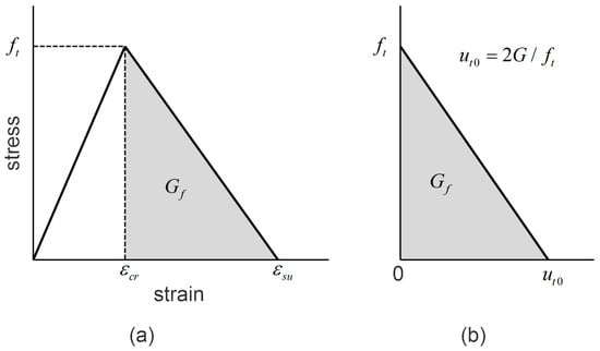 To represent the stress-strain relation of uncracked grout in tension, the bilinear constitutive model shown in Figure 5a is employed [28]. In Figure 5a, the linear portion of a tensile stress-strain response terminates when the stress reaches its ultimate value ft (tensile strength). The corresponding cracking strain is εcr. It is assumed that the elasticity modulus for tension and compression of grout is the same at this linear stage. Subsequently, the material softening occurs, and the stress begins to linearly decrease as the strain increases. The tensile response terminates at the ultimate tensile strainεsu. Figure 5b represents the related stress-deformation curve for the strain softening region, and it is obvious that the area in Figure 5b can be used to represent the fracture energy Gf. In Figure 5b, the horizontal axis stands for the crack width, whose maximum value can be determined through , where lc is the strain gauge length. According to European standard MC90 [27], the fracture energy of grout can be defined as