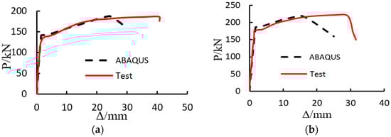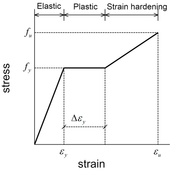 As a classic simplification, the actual constitutive diagram of steel material in tension can, in finite element computation, be replaced by an idealized characteristic trilinear diagram [1,30], as given in Figure 6. The steel is assumed to have a linear stress-strain relation until the yield stress fy is reached. After the yield stress, it is assumed that the stress in the steel remains constant as the strain increases. Then, the strain hardening occurs. In Figure 6, fy is the yield strength, Δεy is the length of yield plateau and fu is the ultimate tensile strength. These key parameters can be determined from the actual tensile experiment of sample. Furthermore, from the elastic region, the material elastic modulus E can be evaluated by fy/εy. In the computation, the elastic modulus of all steel material is 2.00 × 105 MPa. In addition, the Poisson’s ratio is supposed to be ν = 0.3.