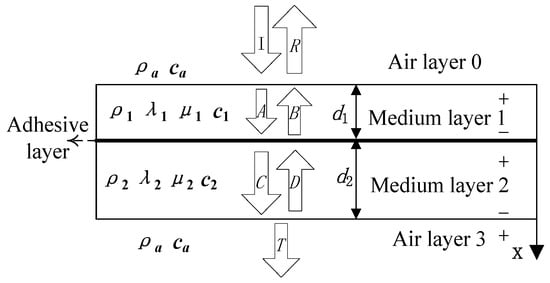 Figure 1 shows the physical model for the detection of the kissing bond interface using normal incidence air-coupled ultrasound. The vertical-incidence method is adopted in the experiment. When the normally plane longitudinal wave is incident on the surface of the tested materials, parts of them are reflected from the air-solid interface and the others transmit into the tested materials. If the amplitude of the incident wave is seen as unit 1, R and T, the amplitude of the reflection and transmission, can be considered the reflection coefficient and transmission coefficient. A and B are the amplitude of incidence and reflection on the adhesive interface, respectively, and C and D are the amplitude on solid-air interface. The symbols + and − denote the top and bottom surfaces of the materials.