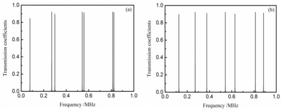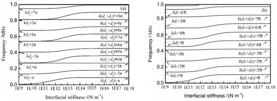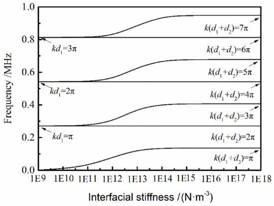 Figure 4a shows the dependence of frequency for transmission peaks on the interfacial stiffness calculated from Equation (15), when the thickness of two PMMA plates are 10 mm and 5 mm, respectively, and Figure 4b illustrates that the thicknesses of double layers are 10 mm and 3 mm, respectively. As shown in Figure 4a, when K→1018 N·m−3 (perfectly bonded), the transmission peaks appear at k (d1 + d2) = nπ (n = 1, 2, 3…). In this case, it is also in good agreement with the half-wave resonance theory. One can also see that as K < 1011 N·m−3 (weak bonded), the transmission peaks are at kd1 = nπ or kd2 = nπ (n = 0, 1, 2…). With the increase of the interfacial stiffness, these peaks shift to the higher-frequency area. The condition when kd1 = nπ or kd2 = nπ can be seen as the starting points that the transmission peaks move toward the higher frequency and the condition when k (d1 + d2) = nπ as the stopping points.