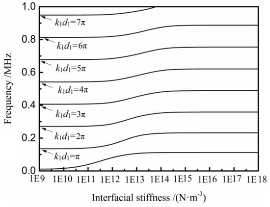 It can also be observed that different frequencies have different sensitivities to the change of the interfacial stiffness from Figure 3. The lower frequencies in these movable frequency areas are more sensitive when the interfacial stiffness is lower. In other words, the higher-frequency peaks show a ‘later shift’ than lower-frequency peaks.