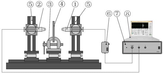 The sample of the tested material is installed perpendicular to the central line of the transducers. ③ is a U-shaped retaining clip, which is used to fix the tested material. ⑤ is the fixation tool of the transducers. ⑥ and ⑦ are the receiver power amplifier and the ultrasonic pulser/receiver, respectively. ⑧ is a personal computer (PC) used to control ⑦ and analyze experimental data.