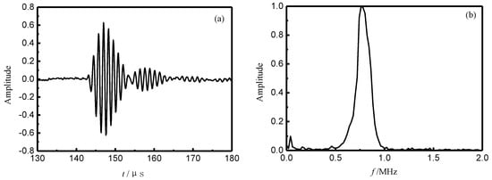 where O(f) is the frequency spectrum of the transmission signal, and I(f) is the frequency spectrum of the incident signal. Firstly, when there is no bonding specimen between the transmitting transducer and the receiving transducer. Meanwhile, the receiving power amplifier, only for amplifying the amplitude of receive signal, is uninstalled. The time signals could be got and shown in Figure 7a. Secondly, a frequency spectrum can be calculated by FFT on the time signal. Finally, I(f) is the frequency spectrum of normalization and shown in Figure 7b. In addition, it is important to note that the normalization and uninstalling the amplifier could not influence the peak position of the transmission coefficient.