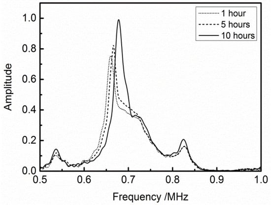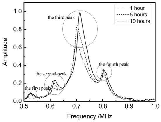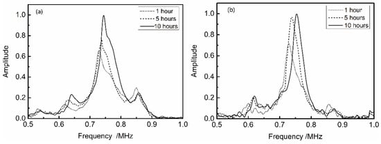Likewise, Figure 10 shows the frequency spectrum of two remaining situations, namely 10 mm PMMA plate and 3 mm PMMA plate bonding, 10 mm PMMA plate and 1 mm aluminum plate bonding. It can be seen that almost all transmission peaks shift towards the higher frequency area, and there is still the phenomenon of ‘later shift’. However, not every peak has the same sensitive to the bonding time. As shown in Figure 10a, the peak between 0.6 MHz and 0.7 MHz is the most sensitive compared with the other frequency area. Similarly, the peak between 0.7 MHz and 0.8 MHz is the most sensitive in Figure 10b.
