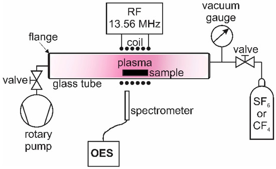 A semi-crystalline PET polymer with a thickness of 0.250 mm was obtained from Goodfellow (Goodfellow Cambridge Ltd., Huntingdon, England). It was cut into small samples of 1 × 1 cm2. The samples were treated in a plasma system, as shown in Figure 1. The plasma was created in a Pyrex discharge tube with a length of 80 cm and a diameter of 4 cm. A coil with 6 turns was placed in the centre of the tube. The coil was connected to a radiofrequency RF generator (13.56 MHz) via a matching network. The generator nominal power was fixed to 200 W. The discharge chamber was pumped with a rotary pump with a nominal pumping speed of 80 m3·h−1. The base pressure was 1 Pa. Sulphur hexafluoride (SF6) or tetrafluoromethane (CF4) gas (supplied by Messer, Messer Group GmbH, Bad Soden, Germany) was leaked into the plasma chamber, and the gas purity was 99.998 and 99.995, respectively. Samples of the PET polymer were placed in the middle of the coil and treated by plasma at various gas pressures. The lowest pressure was set at 10 Pa, whereas the maximum pressure was determined as a pressure at which it was still possible to ignite the plasma. For the SF6 plasma, the highest pressure was 200 Pa, whereas for the CF4 plasma, it was 500 Pa. The treatment time was kept constant at 40 s.