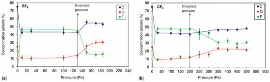 Surface composition of the PET samples treated at various pressures, as determined by XPS: (a) treated in SF6 plasma and (b) treated in CF4 plasma. Two different regions regarding the surface composition are observed at low/high pressures. The values of the atom concentration at a pressure of 0 Pa correspond to the untreated sample.