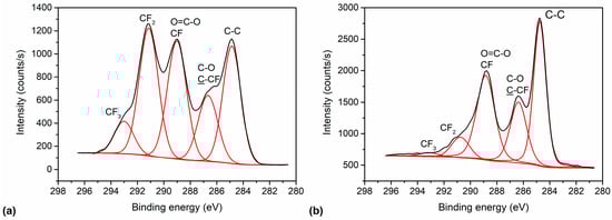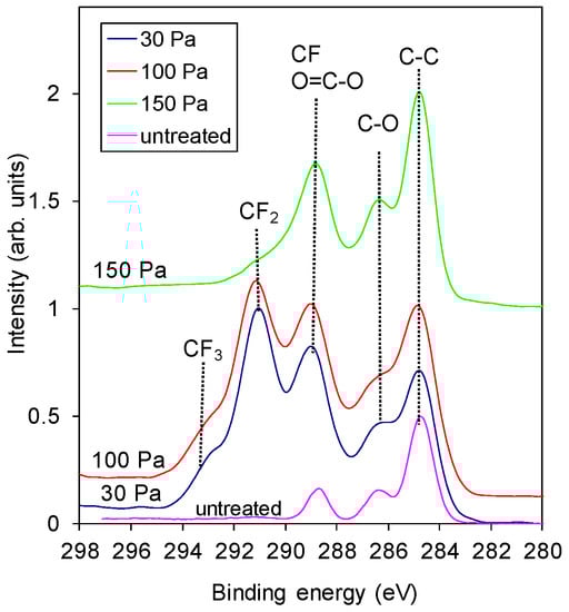 The significant change in the surface concentration of F and O before and after the threshold pressure is also observed in the high-resolution carbon C 1s spectra shown in Figure 3. The samples treated at pressures below the threshold pressure were rich in CF3 and CF2 as well as CF functional groups (see Figure 4 also), whereas the sample treated at pressures higher than the threshold pressure had only some CF groups and an insignificant number of CF2 functional groups in the surface film probed by the photoelectrons. This result is shown in more detail in Figure 4, where an example of a detailed curve deconvolution of the C 1s spectra showing peak assignment is presented. The C 1s peak was fitted with five components positioned at the binding energies of 284.8 eV assigned to C–C, 286.5 eV assigned to C–O and C–CF, 289 eV assigned to O–C=O and CF, 291.3 eV to CF2 and 293 eV to CF3 [20,21].