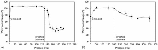 Plasma treatment changed the surface hydrophobicity of the samples. The water contact angle increased from the initial 76° to approximately 106° regardless of using the CF4 or SF6 plasma as long as the pressure was low enough (below the threshold). The value of 106° is typical for hydrophobic materials with a smooth surface [22]. The variation of the contact angle with pressure is interesting, as shown in Figure 6a. We can see that after the threshold pressure, when a decrease in fluorine and an increase in the oxygen concentration were observed (Figure 2a), the water contact angle significantly decreased to approximately 35°. The surface lost its hydrophobic character and became hydrophilic because of a lack of nonpolar fluorine functional groups and the presence of more polar oxygen groups. Interestingly, the water contact angle for PET treated at high pressure in SF6 plasma was much lower than that for the untreated polymer, which was 76°. Measurements of the surface roughness by AFM showed only a slight increase in the roughness from 1.2 nm measured for the untreated sample to 2.3 and 2.6 nm measured for the samples treated in SF6 and CF4 plasma, respectively. Therefore, only a minor influence of the surface roughness on the contact angles was observed, and the major reason for modified wettability is thus chemical modification of the surface. Figure 6b also shows the results for the CF4 plasma. Similar to the results obtained for SF6 plasma treatment, we observed that, after the threshold pressure, the contact angle decreased. However, the decrease was less pronounced, which is correlated with a lower oxygen content in comparison to the sample treated in SF6 plasma (Figure 2).