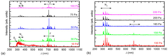 OES spectra of SF6 plasma at various pressures: (a) below the threshold pressure and (b) above the threshold pressure.