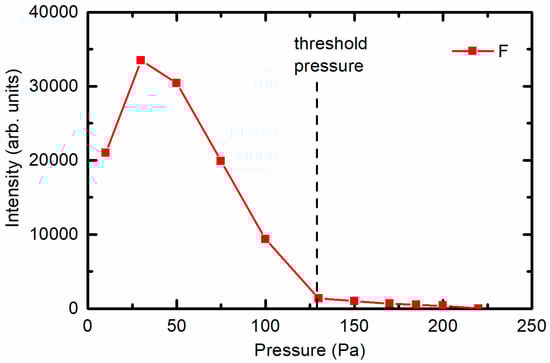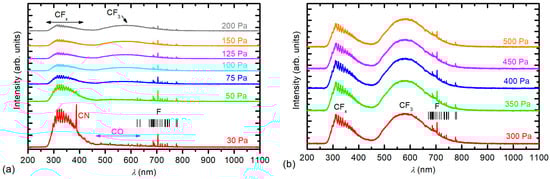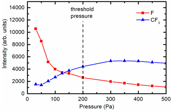 Similar conclusions can be drawn for SF6 plasma as for CF4 plasma. However, CF4 is as strongly electronegative as SF6; therefore, this effect is not very pronounced. For the CF4 plasma, F atomic lines are observed in the OES spectra at low pressures up to the threshold pressure (Figure 9a). The CF3 continuum is not observed below the threshold pressure (200 Pa), where it is barely noticeable.