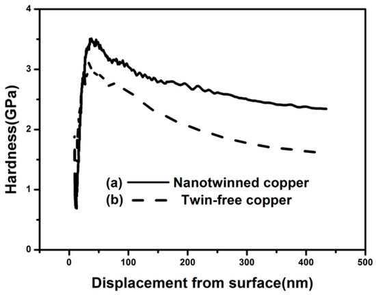 Figure 3a), which is significantly higher than the hardness of 1.73 GPa for the plated copper without nanotwins (see
