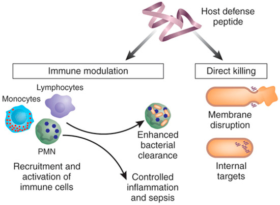 Mechanism of action for cationic anti-microbial peptides; anti-microbial peptides (AMPs) are capable of direct anti-microbial effects and an immune-modulatory effect on the innate immune system, although not all AMPs have both abilities. “Reproduced with permission from [81] published by © Nature Publishing Group.” (2006).