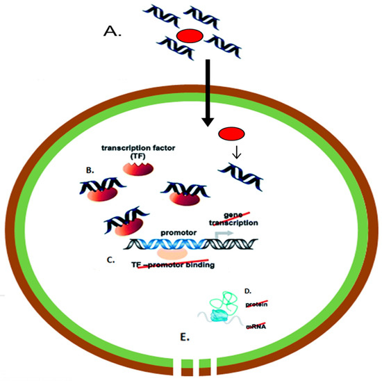 Schematic of nanoparticle-transcription factor decoys (TFD) mediated treatment of MRSA (A) administration of nanoparticle-TFD nanocomplexes to bacteria; (B) TFD release in cytoplasm and binding of transcription factor; (C) inhibition of transcription; (D) failure to produce critical proteins; (E) bacterial inhibition. “Reproduced with permission from [111] published by © Royal Society of Chemistry.” (2014).