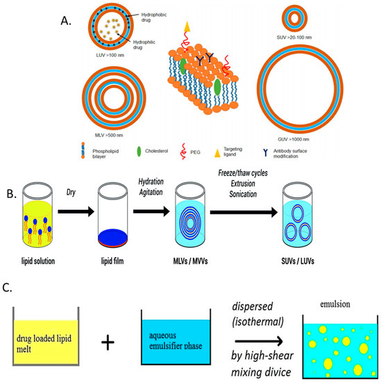 (A) Various conformations and constituents of liposomal formulations. Clockwise from left, large unilamellar vesicles (LUV), small unilamellar vesicles (SUV), giant unilamellar vesicles (GUV) and multilamellar vesicles (MLV); (B) liposome formulation via the thin-film hydration method; and (C) solid lipid nanoparticles (SLNP) synthesis using the hot homogenization technique of organic and aqueous phases. “Reproduced with permission from [139,140,146] published by © American Chemical Society (2015), Royal Society of Chemistry (2016), Pharmaceutical Society of Japan (2015).”