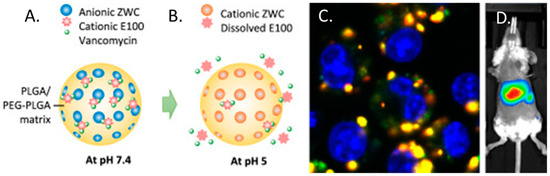 (A) PpZEV composition and behavior at pH 7.4 and (B) degradation and release at pH 5; (C) Uptake of fluorescently labelled vancomycin and PpZEV by MRSA-infected macrophages with vancomycin stained green; PLGA stained red and cell nuclei stained blue and (D) whole body imaging of BALB/c mouse that received DiR-loaded PpZEV nanoparticles by intravenous injection. (Redrawn with permission from [171].)