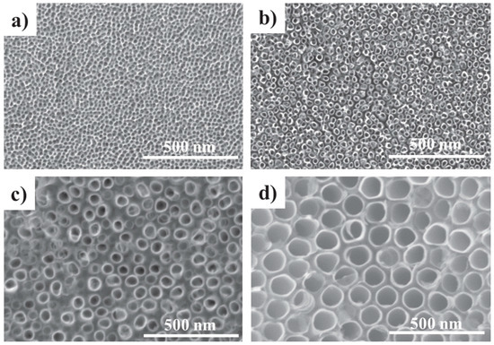 TiO2 nanoscale surface modifications. Representative scanning electron micrographs of (a) 15 nm nanopores; (b) 15 nm nanotubes; (c) 50 nm nanotubes; and (d) 100 nm nanotubes. “Reproduced with permission from [189] published by © IOP Publishing.” (2015).