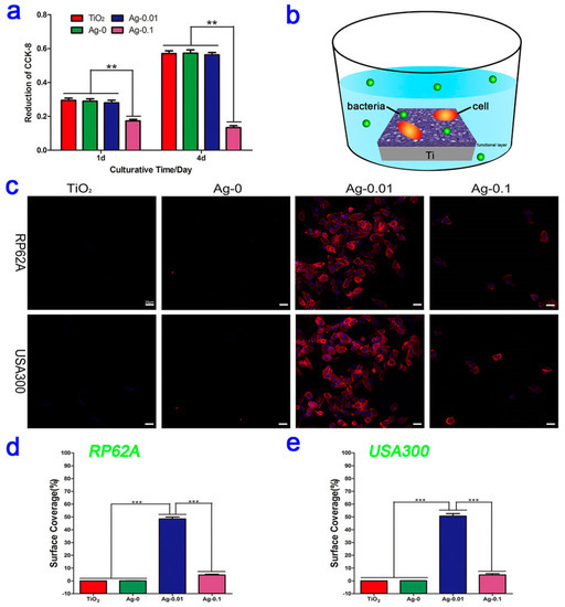 (a) HT1080 fibroblast cytocompatibility cultured on micro-arc-oxidized TiO2 coatings with and without Ag doping. ** p < 0.01 vs. the Ag-0.1 group; (b) Schematic illustration of the co-culturing process for the fibroblasts, bacteria and samples; (c) Fluorescent images of fibroblast cells on four different specimens contaminated with Staphylococcus aureus (PR62A) or Staphylococcus epidermidis (USA300) strains after staining with DAPI (blue) and TRITC-phalloidin (red); (d,e) The corresponding surface coverages of the four samples contaminated with RP62A or USA300. *** p < 0.001. “Reproduced with permission from [51] published by © Nature Publishing Group.” (2016).