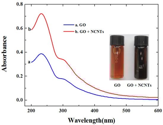 UV-visible absorption spectra of graphene-oxide (GO) (a) and graphene oxide-nitrogen doped carbon nanotubes (GO-NCNTs) (b); the inset shows the objects of GO (a) and GO-NCNTs (b).