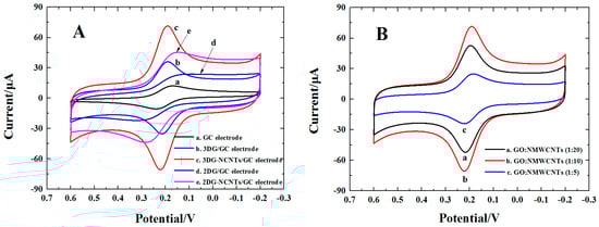 (A) Cyclic voltammograms (CVs) of bare GC electrode (curve a), 3DG (curve b), 3DG-NCNTs (curve c), 2DG (curve d), 2DG-NCNTs (curve e) modified GC electrode in 1.0 × 10−3 mol·L−1 K3[Fe(CN)6] + 0.1 mol·L−1 KCl solution; (B) CVs of the 3DG-NCNTs modified GC electrode prepared in different portions of NCNTs solution in 1.0 × 10−3 mol·L−1 K3[Fe(CN)6] + 0.1 mol·L−1 KCl solution, NCNTs portion: (a) 1:20, (b) 1:10, (c) 1:5, v = 0.05 V·s−1.