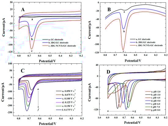 (A) CVs of 1.0 × 10−6 mol·L−1 urapidil on bare GC electrode (curve a), 3DG (curve b) and 3DG-NCNTs (curve c) modified GC electrode in 0.2 mol·L−1 phosphate buffer solutions (PBS, pH = 6.0), v = 0.05 V·s−1; (B) differential pulse voltammetry (DPVs) of 1.0 × 10−6 mol·L−1 urapidil on the bare GC electrode (curve a), 3DG (curve b) and 3DG-NCNTs (curve c) modified GC electrode in 0.2 mol·L−1 PBS (pH = 6.0); (C) CVs of 1.0 × 10−6 mol·L−1 urapidil on 3DG-NCNTs modified GC electrode at different scan rates; (D) CVs of 1.0 × 10−6 mol·L−1 urapidil on 3DG-NCNTs modified GC electrode at different pH values, v = 0.05 V·s−1.