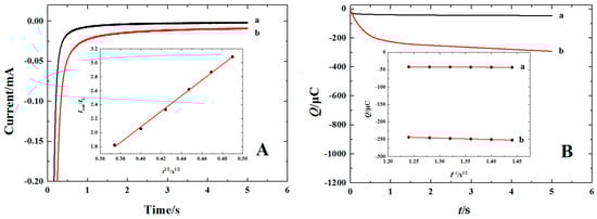 (A) Chronoamperometric curves of the background (curve a) and 1.0 × 10−4 mol·L−1 urapidil (curve b) in 0.2 mol·L−1 PBS (pH = 6.0) on the 3DG-NCNTs modified GC electrode, the inset shows the corresponding relationship of icat/iL versus t1/2; (B) Chronocoulometric curves of the background (curve a) and 5.0 × 10−3 mol·L−1 urapidil (curve b) in 0.2 mol·L−1 PBS (pH = 6.0) on the 3DG-NCNTs modified GC electrode; the inset shows the corresponding relationship of Q versus t1/2.