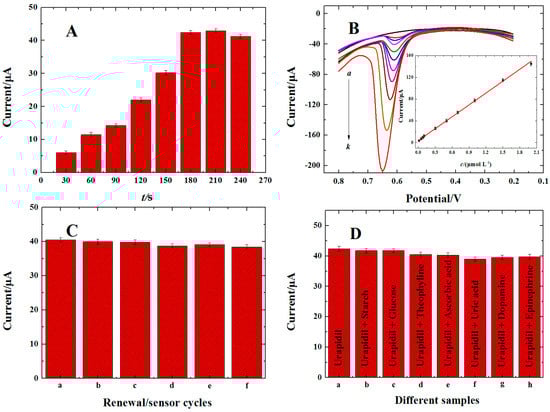 (A) Peak current vs. accumulation time plots for 5.0 × 10−7 mol·L−1 urapidil at open circuit condition; (B) DPASVs of different concentration of urapidil on 3DG-NCNTs modified GC electrode under the optimum conditions; the inset shows corresponding calibration curve of c for ipa; (C) Influence of renewal step on the ipa detected on 3DG-NCNTs modified GC electrode; (D) Influence of different interfering compounds on the ipa detected on 3DG-NCNTs modified GC electrode.