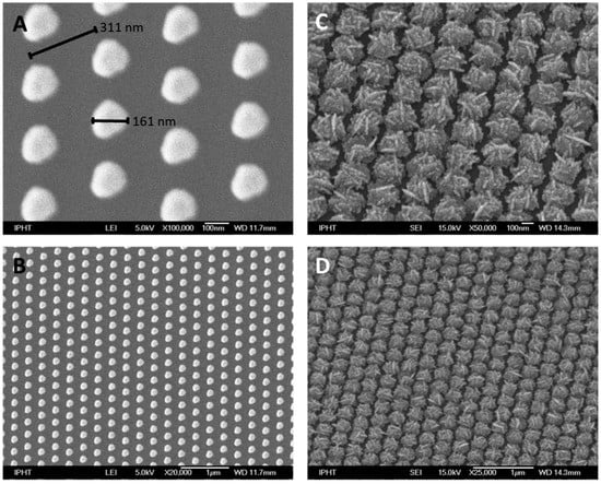 SEM images of the gold template as well as of the created TopUp@silicon substrates are illustrated in Figure 1. The gold island film consists of hexagonally arranged gold dots on a silicon wafer as shown in Figure 1A. The dot size is in the range of 160 nm and the period is ~310 nm. This nanostructured surface was achieved by a combined electron beam lithography and lift-off process as mentioned within chapter 4 ‘Materials and Methods’. Thus, the isolated gold islands serve as seeding particles for the bottom-up synthesis of silver nanostructures []. The arrangement of the gold islands template structure was chosen as a closest packaging of hexagonal arranged dots in order to allow for high SERS signal intensities and homogenous distribution. Thus, a high coverage of silver nanostructures on the surface is guaranteed. The SEM images of the resulting TopUp@silicon substrate are depicted in Figure 1C,D, illustrating that the arrangement of the gold islands is preserved on the final SERS active substrate. As shown, homogeneously and perfectly ordered silver nanostructures with interstitial silicon regions were fabricated. Thus, the Raman signal of silicon will serve as an internal standard since it is expected that both the SERS signal of the analyte molecule as well as the Raman signal of the supporting material will contribute to the overall readout signal.