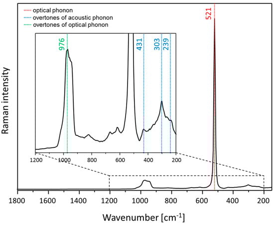 Raman spectrum of crystalline silicon. The Raman spectrum is dominated by the optical phonon mode at 521 cm−1. Overtones of optical phonons as well as acoustic phonons are marked accordingly.