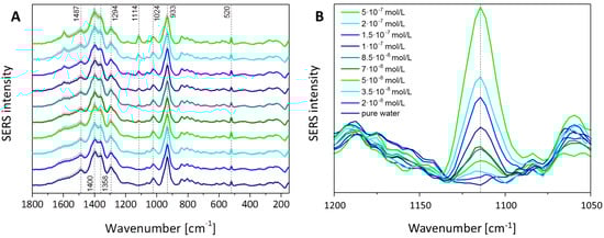 Concentration-dependent surface-enhanced Raman spectroscopy (SERS) signal intensity of sulfamethoxazole (SMX): (A) The marker mode of SMX at 1114 cm−1 is marked and in (B) the enlarged Figure section is shown, illustrating the increase in signal intensity with increasing concentration.