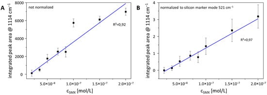 Concentration-dependent peak area as function of the SMX concentration (A) without normalization and (B) after normalization by using the peak area of the silicon marker mode at 521 cm−1 as internal standard.