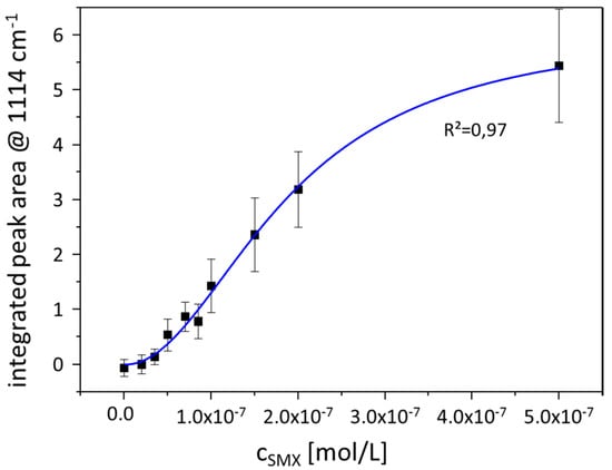 Correlation between the normalized peak area of the marker band at 1114 cm−1 and the SMX concentration fitted with a Langmuir–Freundlich profile. The concentration values are identical with the values provided in Figure 3.