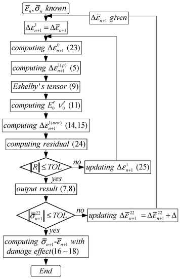 Based on the completed stress–strain curves by the above iteration, the shear-band density ρ is determined, and then the overall elasticity is given. Based on Equations (16)–(18), the stress–strain curves for the BMGCs can be re-evaluated by involving the damage effect. The above-mentioned numerical implementation procedure is illustrated by the flowchart in Figure 1, and a Fortran code was programmed to predict the stress–strain relations of BMGCs.