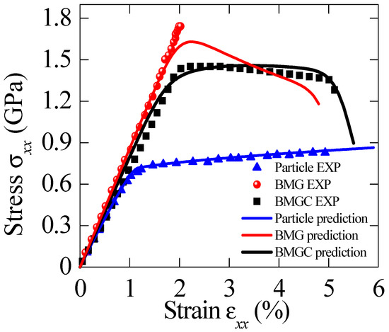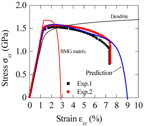 Szuecs et al. [18] prepared a Zr-based BMGCs with dendrite volume fraction of c1 = 20%, and measured their mechanical properties under tension. The dendrites are described by Equation (5), and their properties are: E1 = 72 Gpa, v1 = 0.4, σy = 700 Mpa, h = 1200 Mpa, and n = 0.65. The material properties for Zr-based BMG are: E0 = 86 Gpa, v0 = 0.36, ξ0 = 0.05, nD = 3, α = 0.5, β = 0.9 and σ0 = 125 Mpa. The predictions are compared with the measured results shown in Figure 2, where ε0 = 0.04 and m = 18 are used. All the predictions agree with the experiments very well, and strain-softening effect and the collapse stage can be clearly reflected by the damage model.