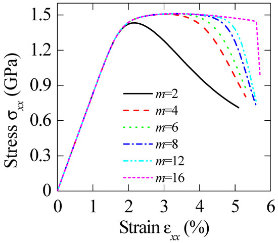 Stress–strain relations of BMGCs with different Weibull modulus m, where ε0 = 0.06 is adopted.