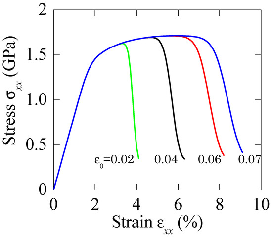 The impacts of model parameters in the present method should be carefully explained. Figure 5 and Figure 6 demonstrate the effect of Weibull modulus m and reference strain ε0 on the overall stress–strain curves, respectively. In Figure 5, the Weibull modulus m ranges from 2 to 16, and the reference strain ε0 = 0.06. At a given particle volume fraction, the plastic elongation increases with increasing Weibull modulus, which is controlled by the physics meaning of Weibull modulus. Additionally, the dependence of the overall stress–strain relations on reference strain ε0 is illustrated in Figure 6. As expected, the uniform stretches decrease with the increase in micro-crack density. For the reference strain less than 0.1, the difference in plastic elongation becomes evident.