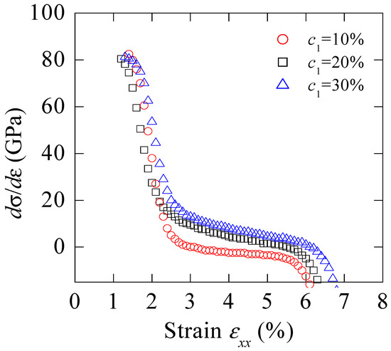 Based on the work hardening coefficient, the ability to endure damage can be judged for engineering materials. The reliance of work-hardening rate dσ/dε on particle concentration is shown in Figure 7. Here, the definition of dσ/dε, is used to describe the resistance to flow localization, i.e., necking. It is noted that the value of dσ/dε is higher for BMGCs with higher filler volume fraction. Moreover, the value reduces rapidly with deformation for dilute composites. These curves also show that uniform elongation becomes larger with the higher initial hardening rate. Since the material with a high dσ/dε can lead to a much uniform plastic flow, which is against the early appearance of deformation localization, and an increased stretch is finally reached.