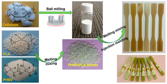 Mechanical properties of the ternary composite materials were tuned according to the complementary physicochemical advantages of raw materials. There are three steps to fabricating the bioderived ternary composite materials, i.e., ball milling the cellulose fibers to access the filler with appropriate physicochemical properties, PHBV/PLA blending with extrusion followed by injection molding, and compound blending of cellulose/PHBV/PLA, as illustrated in Figure 1.