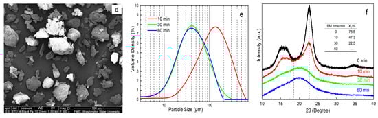 There are some fibrils on the surfaces of the single raw pulp cellulose fibers, as shown in Figure 2a. These fibers are entangled with each other, due to their high aspect ratio, so they cannot be used to fill polymer directly via extrusion or injection molding processing. The ball-milling process destructed these loose, interentangled pulp cellulose fibers, and turned them into irregular particles, due to intense mechanical stress [36]. Ball milling the raw cellulose fibers for 10 min produced cellulose particles with an average size of 120.0 μm (Figure 2b), which makes it possible for them to be used as a filler or modifier for polymeric composites via the traditional melting process, such as extrusion and injection molding. The longer ball-milling time contributed to not only a smaller particle size and narrower particle size distribution, but also more regular particle shapes (Figure 2b–d). However, the size reduction effect became no longer obvious when the ball-milling time was more than 30 min. For example, an increase in the ball-milling time from 30 min to 60 min only lead to a 0.8-μm decrease on the average particle size (from 39.7 μm to 38.9 μm, see Figure 2c–e).