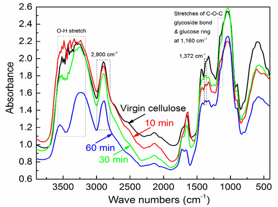 The effects of ball milling on cellulose fibers can also be observed via FTIR analysis [43]. As shown in Figure 3, both the shape changes of the FTIR spectra over two ranges (3700–2800 cm−1 and 1500–600 cm−1, respectively) and a slight position shift of band maxima were observed for the ball-milled cellulose particles, compared with that of the virgin pulp cellulose fibers. Here, the most conspicuous changes were in the broad range from 3200 cm−1 to 3650 cm−1, and at the wavenumbers of 1160 cm−1, which are assigned to the characteristic stretching of intra and intermolecular hydrogen bonds, and the deformation vibrations of the C–O–C bond and the glucose ring, respectively. They were sensitive to the ball-milling process [43]. The relative band heights of the band at 1160 cm−1 decreased, while the OH-stretching vibration region became broader as the ball-milling time increased.