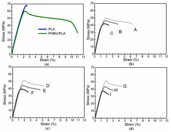 Typical stress–strain curves of the cellulose/PHBV/PLA ternary composites, with that of PLA and PHBV/PLA as reference. Panel (a) describes stress–strain curves of PLA and PHBV/PLA. Panel (b) shows that of Sample A, B, and C, respectively. Panel (c) is that of Sample D, E, and F, respectively. Panel (d) describe that of Sample G, H, and I, respectively.