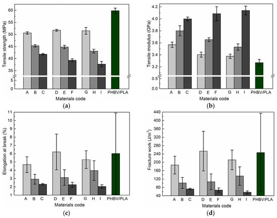 Tensile strength, tensile modulus, elongation at break, and fracture work of the ternary cellulose/PHBV/PLA composite materials, compared with that of the PHBV/PLA blends as reference. Panel (a–d) show tensile strength, tensile modulus, elongation at break, and fracture work, respectively.