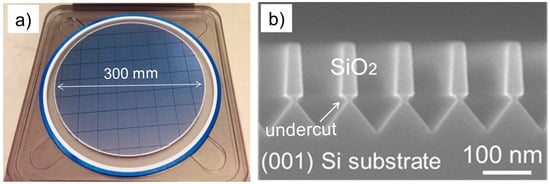 - Merckling, C.; Waldron, N.; Jiang, S.; Guo, W.; Richard, O.; Douhard, B.; Moussa, A.; Vanhaeren, D.; Bender, H.; Collaert, N.; et al. Heteroepitaxy of InP on Si (001) by selective-area metal organic vapor-phase epitaxy in sub-50 nm width trenches: The role of the nucleation layer and the recess engineering. J. Appl. Phys. 2013, 114, 033708. [Google Scholar] [CrossRef]