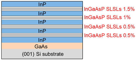 - Samonji, K.; Yonezu, H.; Takagi, Y.; Iwaki, K.; Ohshima, N.; Shin, J.K.; Pak, K. Reduction of threading dislocation density in InP-on-Si heteroepitaxy with strained short-period superlattices. Appl. Phys. Lett. 1996, 69, 100–102. [Google Scholar] [CrossRef]