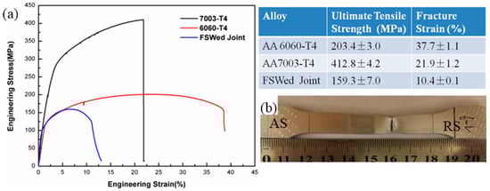 14]. In our study, by placing the soft alloy on RS, it is easier to form flawless joints since the material flow is more convenient to fill the cavity behind the pin during FSW Consequently, the setting of the dissimilar plates, i.e., 6060 in RS and 7003 in AS, is beneficial to produce sound joints. Moreover, since the majority of the nugget is composed of 7003 alloy with higher strength, the strength of the joint can also be improved.