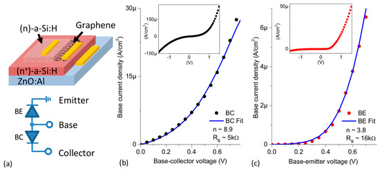 (a) Schematic illustration of a graphene monolayer (black) embedded by two (n)-a-Si:H layers (the top layer is the emitter and the bottom layer is the collector). Forward-bias output characteristics of the (b) BC (base-collector) and (c) BE (base-emitter) interfacial diodes. Insets: Forward and backward bias of the (b) BC and (c) BE diodes.