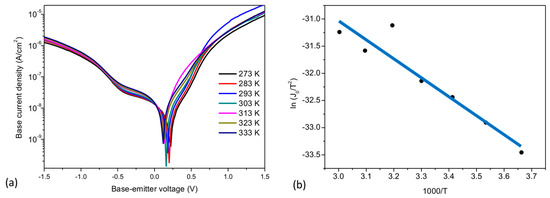 (a) Temperature dependent IV characteristics from 273 K to 333 K and (b) Richardson plot for the extraction of the base-emitter interface barrier height.