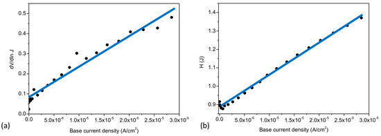 The values of were directly extracted by extrapolating the linear part of the output characteristics to the interception voltage of 0 V. Based on Equation (2), the base-emitter Schottky barrier, ~0.3 eV, was determined from the slope of a vs 1000/ plot (Figure 2b).