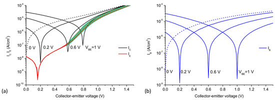 The electrical behavior of the device will now be discussed at ≠ 0 V. For 0.2 V < < 1 V. The current flow is still dominated by a base-collector (~) current, i.e., has a negligible dependency to the base voltage even during forward bias conditions of the BE diode. This behavior is caused again by the ohmic behavior of the BC junction, the low bulk resistance of the collector layer and/or the diode efficiencies of the junctions. At all applied , and reach a minimum (current dip) before changing to positive and negative values respectively. The current dip position of corresponds to the applied and can be understood by leveling the Fermi levels, i.e., collector-base voltage is 0 V. The visible “V” shape characteristics of is caused by a change of the current flow due to the large leakage currents of the BC junction (an ideal diode would allow only a low reverse current). The current dip of demonstrates a different behavior. As raises above 0.5 V, the exponential increase of prevents the current dip from coinciding with the applied , i.e., at = 0 V.