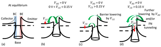 In an ideal GBHT device, both BE and BC junctions exhibit significant thermionic barrier heights. The barrier heights, and thus the collector-emitter current, are controlled by the base voltage applied to the graphene layer. Since = 0 V, the electrical performance of our device demonstrates that neither low (off) state nor saturation could be achieved, meaning that the device does not work as a conventional bipolar transistor at this point. To exemplify this case, a simplified band diagram of the GBHT in equilibrium (Figure 5a) illustrates the reduced barrier of the BC interface (the ideal barrier shown as a dashed line).
